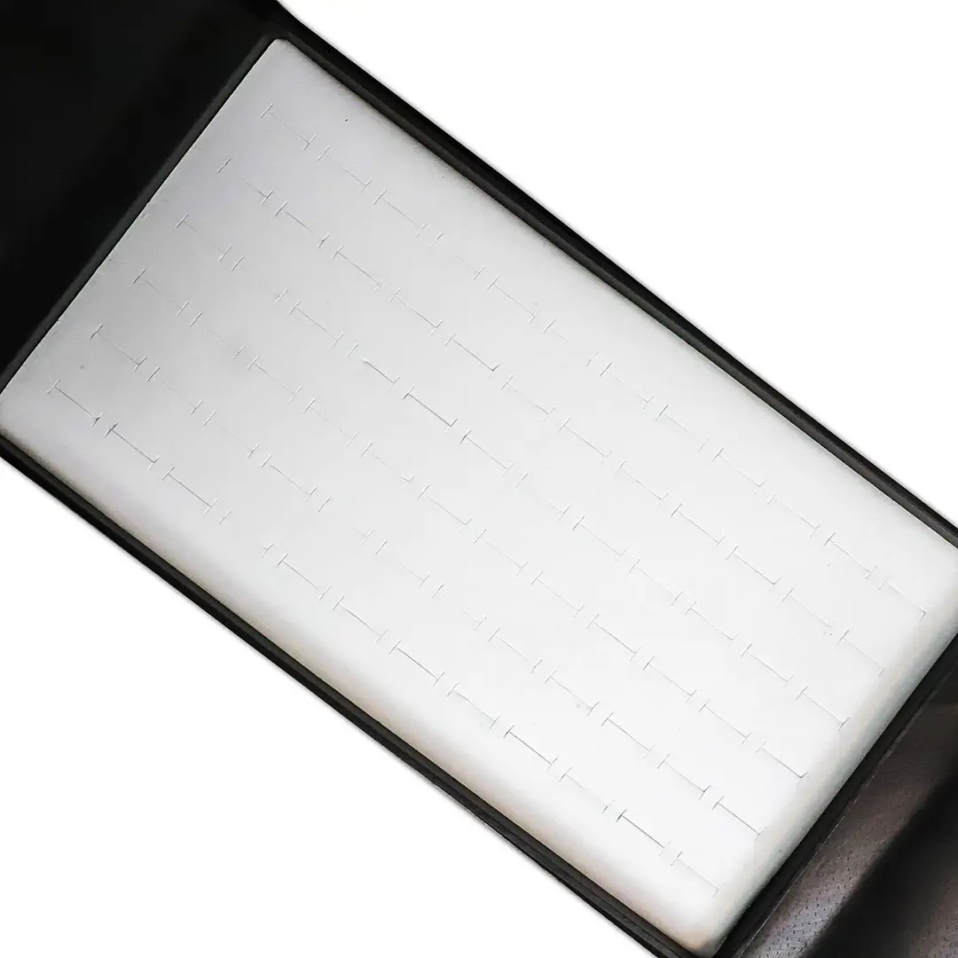 Exhibidor de anillos portátil con cierre tipo solapa. Interior acolchado con ranuras para una presentación prolija y segura. Ideal para mostrar y transportar múltiples modelos de forma práctica y elegante.